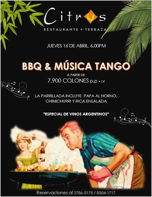 Thursday 16th, BBQ & Tango Music Night. Starting at 7.900 colones p.p: Barbecue includes Baked potatoes, Chimichurri and a delicious salad.