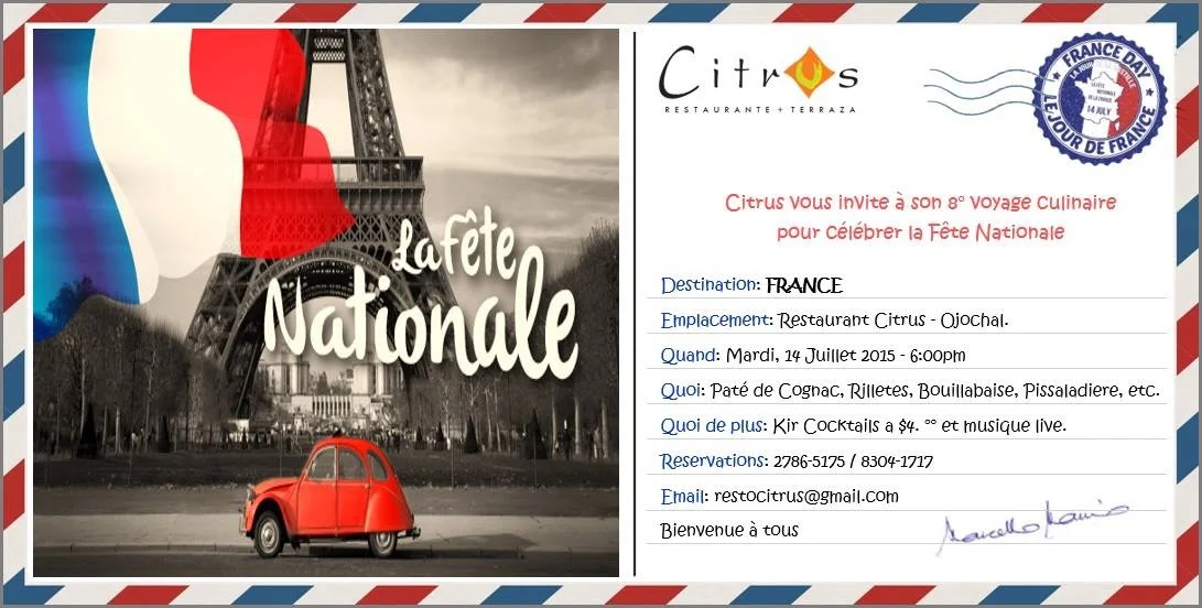 Citrus invites you all for its 8° culinary destination by celebrating FRANCE' National Day. We will have a nice menu of typical tapas and live music!