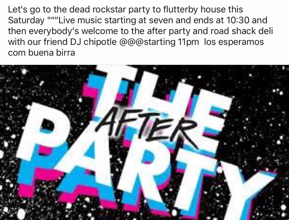 The night doesn't have to end with The Rockstar Party at Flutterby House. Head on over to Roadshack Deli for more fun times, great atmosphere & cold drinks. With a DJ named Chipotle, you know it's gonna be on fire!