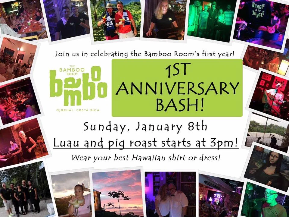 1st Aniversary Bash at the Bamboo Room Sunday, January 8, 2017 3:00 PM 9:00 PM 15:00 21:00 The Bamboo Room Ojochal (map) Google Calendar ICS Luau and Pig roast!Wear your best Hawaiian shirt or dress!