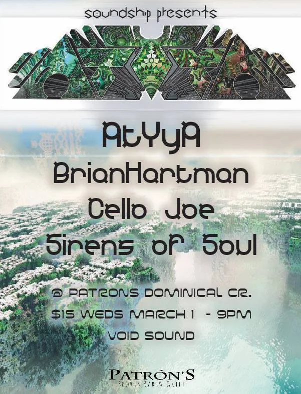 Soundship presents AtYya at Patron's Wednesday, March 1, 2017 9:00 PM 11:59 PM 21:00 23:59 Patron's Playa Dominical (map) Google Calendar ICS Starts at 9 pm at Patron'sTickets are $15